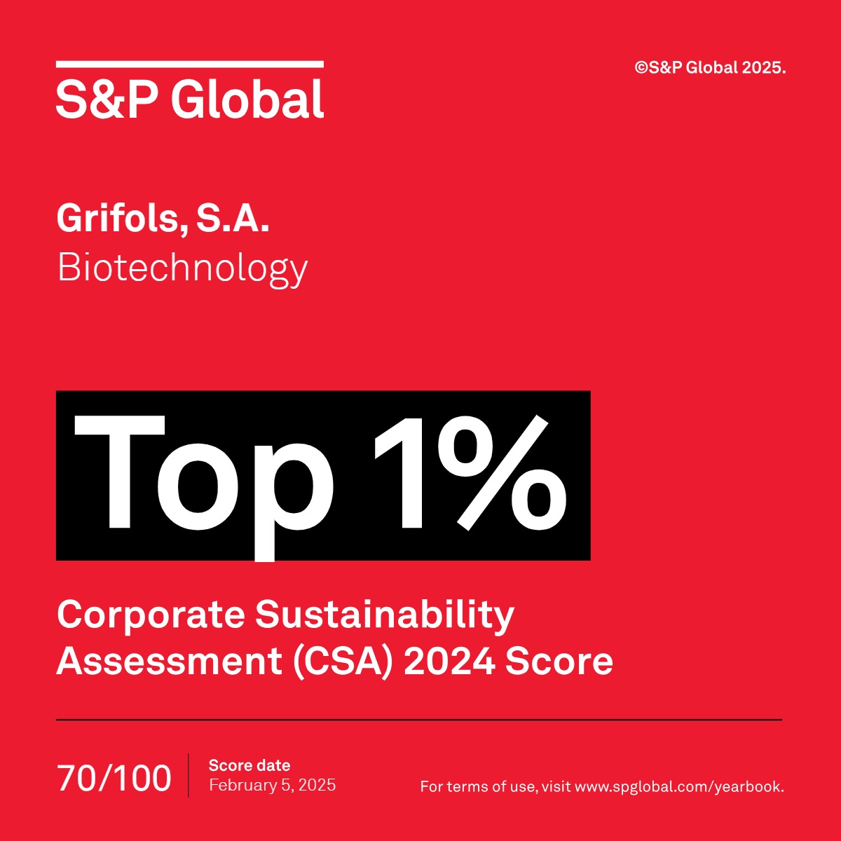 Grifols ranked number one biotech company in the Dow Jones Best-in-Class Indices (formerly known as DJSI) in its fifth straight year of inclusion in these prestigious indices. This recognition comes as the company achieved its highest-ever S&P Global Corporate Sustainability Assessment (CSA) score, with a rating of 70 points.