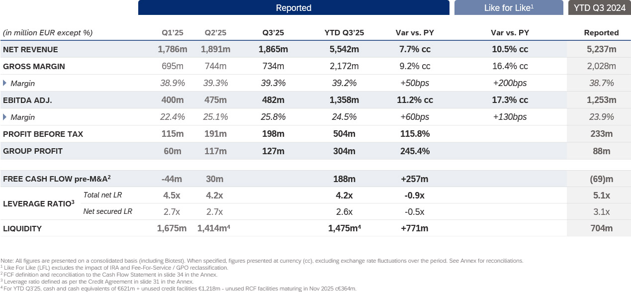 Grifols registered a net profit of EUR 304 million year-to-date, up 245% compared to the same period of 2024, supported by a total of EUR 127 million in the third quarter, an increase of 146%, in line with the previous quarter. Free cash flow pre-M&A pre-dividend reached EUR 203 million in the third quarter, resulting in EUR 188 million for the first nine months of the year. This represents a EUR 257 million year-over-year improvement, mostly driven by EBITDA expansion, lower CAPEX and cash interest costs.