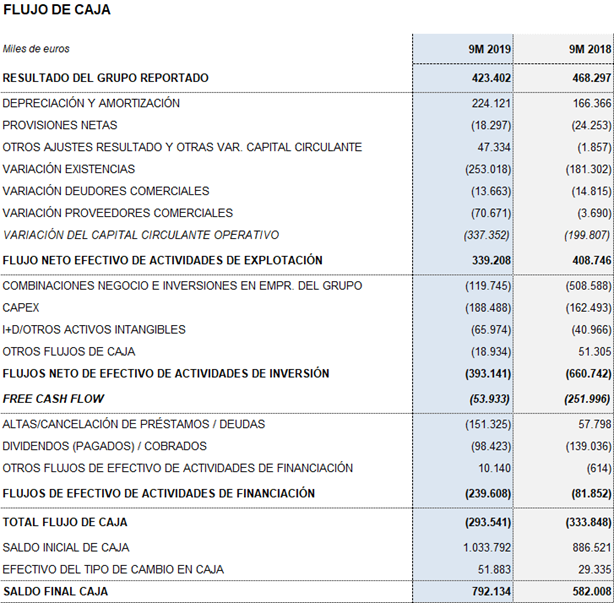 La compañía mantiene una sólida generación de caja operativa, que alcanza los 339,2 millones de euros hasta septiembre de 2019 y le permite acometer con solvencia los proyectos de crecimiento previstos.