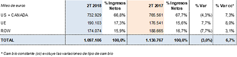En el segundo trimestre de 2018, los ingresos de Grifols se han situado en 1.097,1 millones de euros que suponen un crecimiento del +6,7%2 cc y del -3,0% teniendo en cuenta los tipos de cambio. La evolución de las ventas ha sido positiva en las divisiones principales, así como en todas las regiones en las que opera. Destacan los avances en los principales países de la Unión Europea (+8,0% cc y +7,7%) y en EE.UU. y Canadá (+7,3% cc y -4,3%).