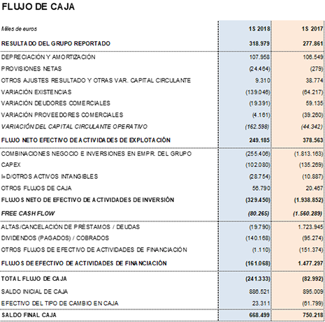 A finales del primer semestre de 2018, la deuda financiera neta de Grifols se ha situado en 5.560,3 millones de euros, incluyendo 668,5 millones de euros de caja y teniendo en cuenta, entre otros, el cierre de la adquisición del 100% del capital de Haema por 220 millones de euros, así como el pago del dividendo final correspondiente al ejercicio 2017 por importe total de 142,1 millones de euros aprobado en la Junta General Ordinaria de Accionistas.